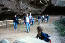 Three short hikes took us to Hazard Cave, Indian Rockhouse, Twin Arches, and a series of large sandstone bluffs and rock shelters. Each location features impressive displays of Pennsylvanian-age sandstones and conglomerates. Patterns of jointing, crossbedding, and lisegang banding add to the natural beauty of the rock. The effects of weathering and erosion are easily observed in the arches and shelters, as well as in the dramatic gorges incised into the "layer-cake" geology of the plateau. The rock shelter at Hazard Cave is so deeply cut into the bluff, that near-total darkness prevails in the rear portions of this feature even at midday. Hazard Cave provides habitat for a recently discovered population of "glowworms," which are really the larvae of the fungus gnat (Diptera mycethoilidae) [The Official Guide to the National Park Service Activities and Events, Big South Fork, 1999, p. 16).